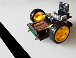 Program: from microbit import * from mbutils import * display.show(Image.YES) while not button_a.was_pressed(): sleep(10) buggy_setSpeed(15) buggy_forward() while not button_b.was_pressed(): if isDark(ldrL) and not isDark(ldrR): buggy_forward() elif isDark(ldrL) and isDark(ldrR): buggy_rightArc(0.6) elif not isDark(ldrL) and not isDark(ldrR): buggy_leftArc(0.6) sleep(10) buggy_stop() display.show(Image.NO) 5. Remote control with a second micro:bit