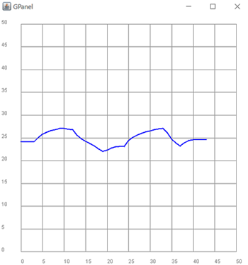 Das Grafik-Fenster wird mit makeGPanel (-5, 53, -3, 52) erzeugt. Es wird in der Regel etwas grösser gewählt, damit die Beschriftung der Koordinaten-Achsen sichtbar ist. pos(x, y) setzt den Grafikcursor an die gegebene Koordinate, draw(x, y) verbindet den aktuellen Punkt mit dem Punkt(x, y). Die x-Koordinate wird nach jedem gezeichneten Wert umd 1 vergrössert. Wenn sie das Ende des Fensters erreicht hat (x = 50), beginnt die Aufzeichnung wieder am linken Rand (x = 0). Weitere Erklärungen zu den Bibliotheken ev3robot und gpanel findest du unter www.jython.ch/ev3 from ev3robot import * from gpanel import * makeGPanel(-5, 53, -3, 52) drawGrid(0, 50, 0, 50, "gray") setColor("blue") lineWidth(2) robot = LegoRobot() sht = SHTSensor(SensorPort.S3) robot.addPart(sht) x = 0 while not robot.isEscapeHit(): v = sht.getValues() temp = v[0] if x == 0: pos(x, temp) else: draw(x, temp) print(temp) x = x + 1 if x == 50: x = 0 clear() drawGrid(0, 50, 0, 50, "gray") Tools.delay(1000) robot.exit()