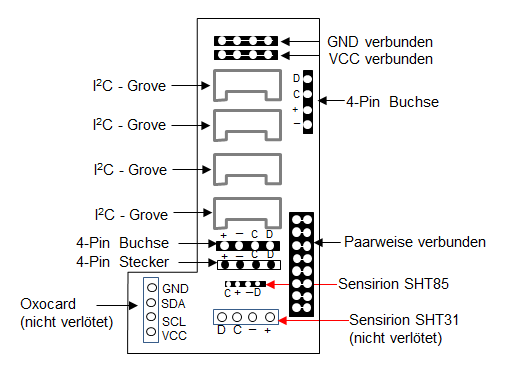 Der Didel-mbHub und SensorLink sind so konzipiert, dass sie für den Anschluss von weiteren I2C-Sensoren und Elektronik-Komponenten verwendet werden können. Sie verfügen über drei I2C-Grove-Stecker und über weitere 4-Pin Headers (Stecker und Buchsen, 2.54 mm Norm). Die Grove-Stecker haben immer 4 Pin-Anschlüsse (GND, VCC, SDA, SCL). |