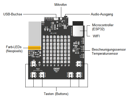 Die Oxocard ist ein in der Schweiz entwickelter programmierbarer Computer, der in einer Kartonbox verpackt ist (Bezugsquelle: www.oxocard.ch). Er besteht aus einer ca. 10 x 10 cm grossen Platine mit einem ESP32 Microcontroller, Flash Speicher, ColorLEDs (Neopixels), mit welchen du einfache Bilder und Nachrichten anzeigen kannst, 6 Buttons und einer USB-Schnittstelle.