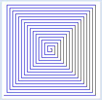 | 2. | Die Turtle bewegt sich a = 10 Schritte vorwärts, zeichnet einen Punkt, bewegt sich um die gleiche Strecke zurück und dreht 10 Grad nach rechts. Dann vergrössert sie die Streckenlänge a um 10. Diese Bewegung wiederholt sie so lange die Streckenlänge a kleiner als 300 ist |